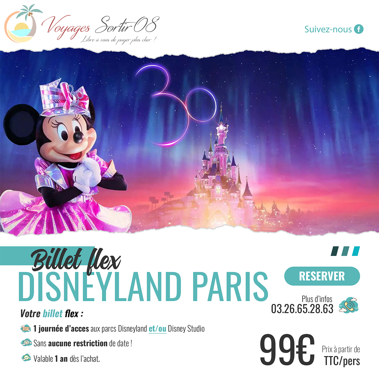 Ce billet ne donne accès au(x) Parc(s) Disney de votre choix que s’il est accompagné d’une réservation pour la date de visite choisie (sous réserve de disponibilité), effectuée au plus tôt sur la plateforme prévue à cet effet : disneylandparis.com/fr-fr/enregistrement-billets/.