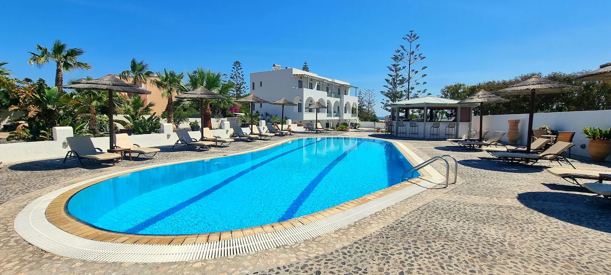 Petit hôtel de charme 3 étoiles à Kamari, Santorin : piscine, petit-déjeuner inclus, ambiance familiale authentique.