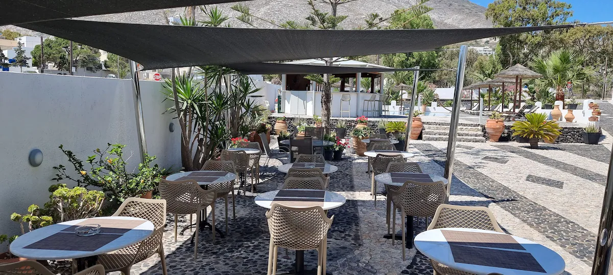 🌙 Soirée : Soirées détente à la piscine et au bar du resort. Le célèbre Open Air Cinema Kamari est situé à 5 minutes à pied du resort, proposant des projections cinéma en plein air pendant la saison estivale. Ambiance relaxante dans les jardins du resort en soirée.