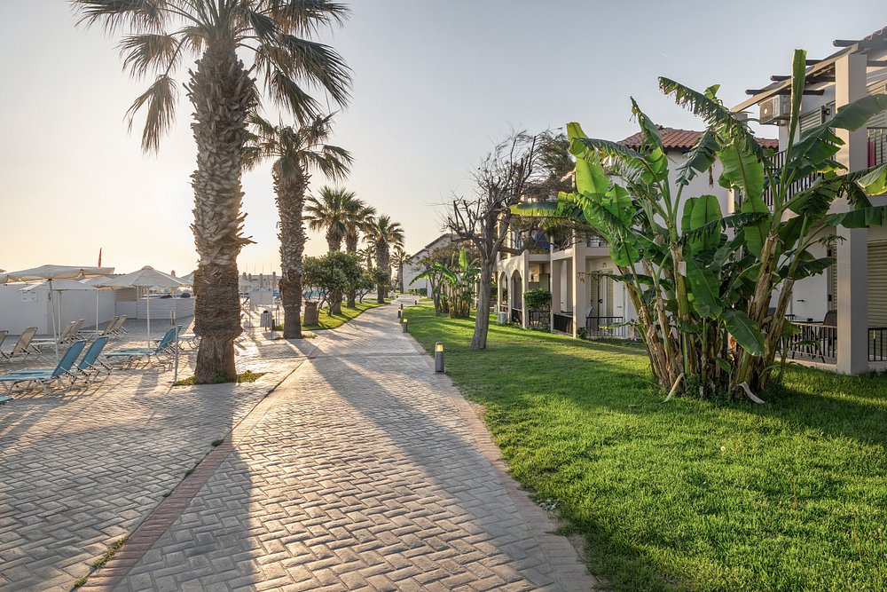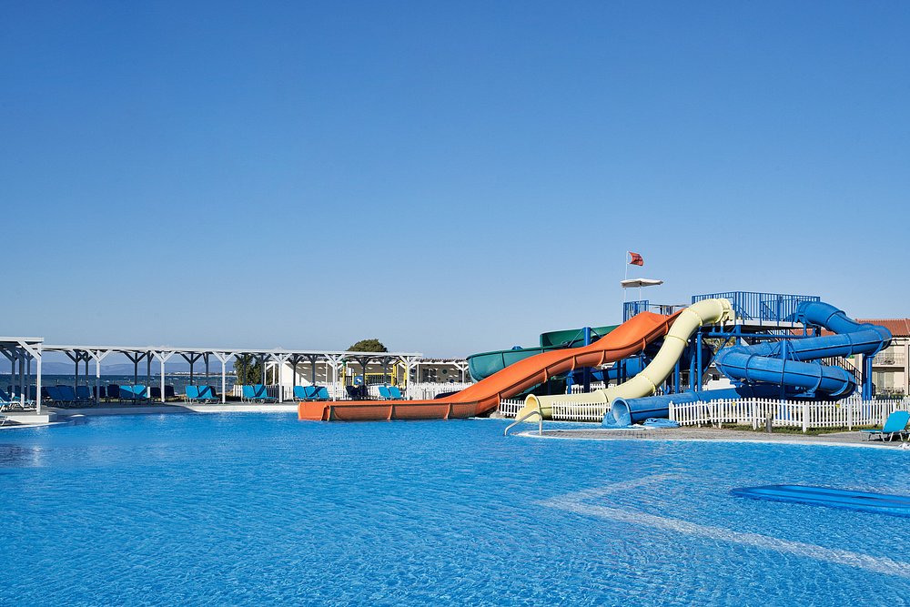 Plage privée de sable fin directement accessible depuis le resort, en première ligne. Transats et parasols inclus dans le forfait all-inclusive. À noter : certaines zones comportent du gravier ou des petits rochers avant la baignade, mais du sable pur se trouve à proximité immédiate. Ambiance méditerranéenne avec vue sur la côte turque. Idéale pour familles avec enfants grâce à la proximité des installations.